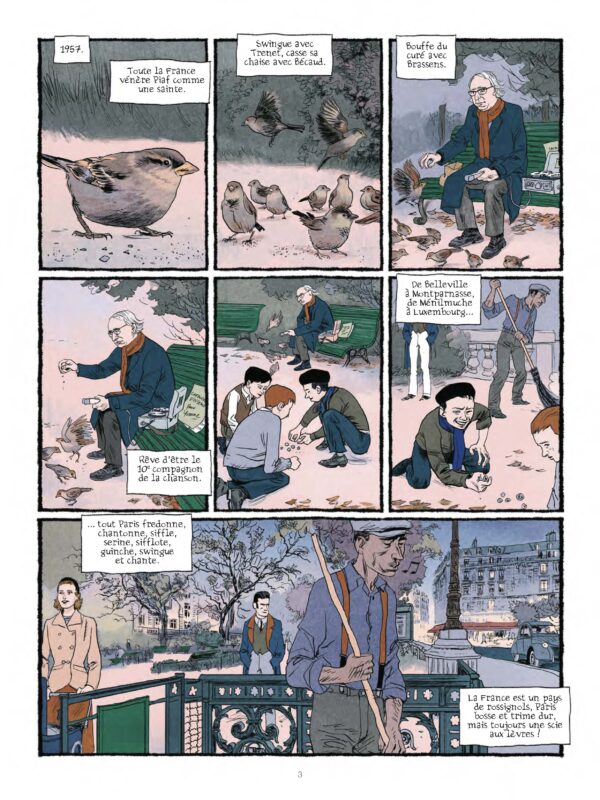 Ci-dessous, la première planche du « temps des copains » dessins de Jeff pourquié, chez casterman… le monsieur sur le banc, c’est Olivier messiaen…